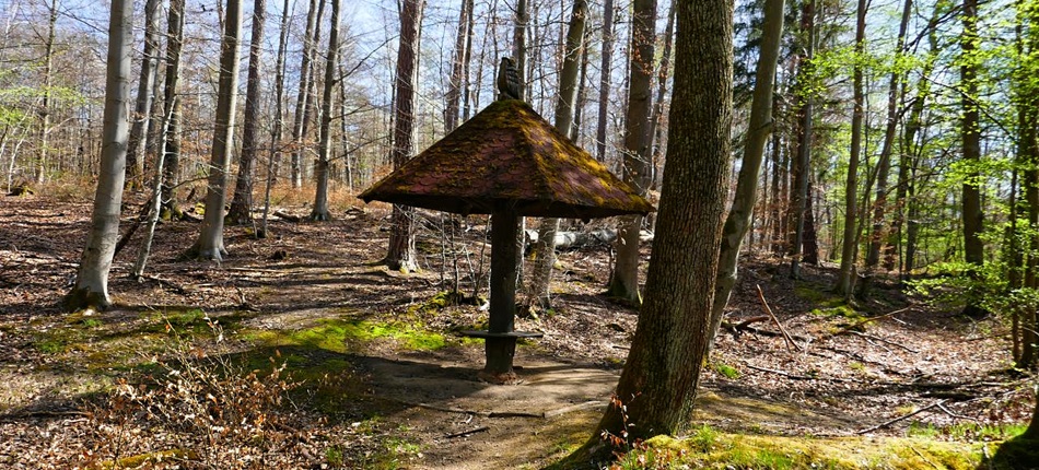 Nach diesem Besuch führt der betonierte Weg über offene Flächen zum Waldrand. Etwas holpriger geht es dann hinab zum Bernhards-Brunnen (mit Schutzhaus). Den Bach entlang erreicht man anderthalb Kilometer Später den Steinbrücker Teich. Spielplatz und Tretboote deuten es an: ein beliebtes Ausflugsziel direkt an der Strasse. Kurz danach passiert man den Falkenhof und das Kranichsteiner Jagdschloss am Backhausteich. Es lohnt sich, wenigstens mal auf den Hof des Jagdschloss zu gehen, denn die Fassade versetzt einen in eine andere Zeit.