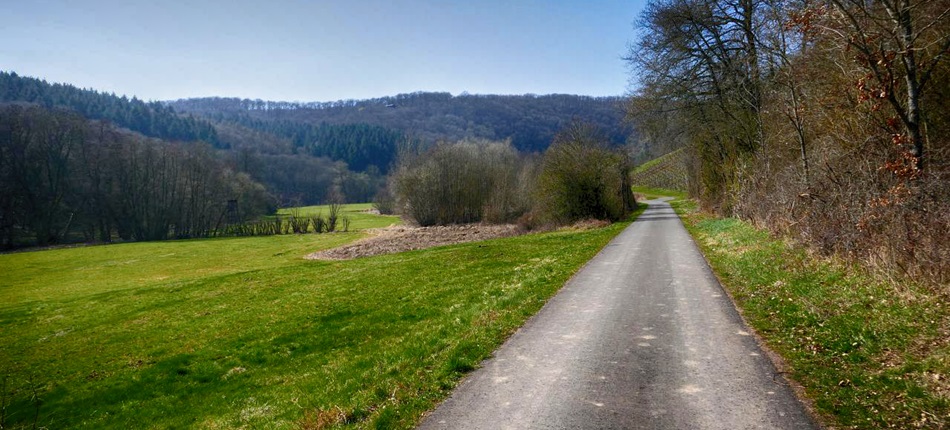 In Rüdesheim an der Nahe gibt es in der Mühlstrasse nahe des Friedhofs einen Wanderparkplatz. Ab hier geht es zunächst durch die beschauliche Strasse „Im Wiesengrund“, bis der Weg am Freibad Rüdesheim vorbei zum Radweg wird. Unter der B41 hindurch erreicht man Weinsberg. Auch hier geht es auf Nebenstrassen durch das Dorf und bald wieder hinaus auf einen herrlichen Radweg entlang des Ellerbachs. Kurz vor Bergsponheim erreicht man wieder die wenig befahrene Kreisstrasse und hat nun den ersten Anstieg vor sich.