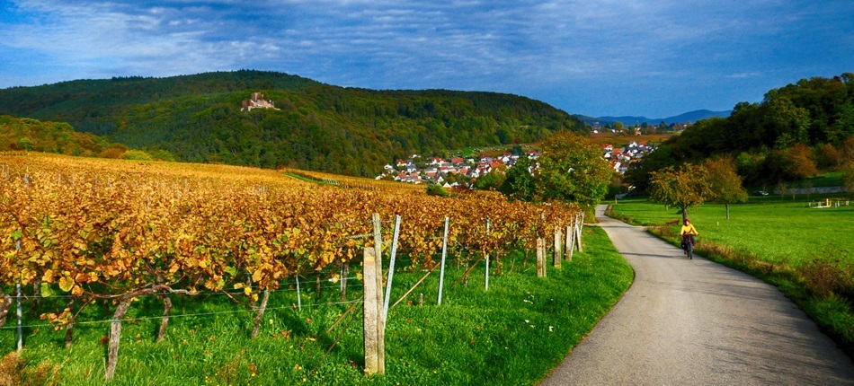 Eine Radrundtour am südlichen Ende der Pfälzer Weinstrasse hinüber ins Elsass und durch die Täler des Dahner Felsenlandes im südlichen Pfälzer Wald wieder zurück. Am Anfang mit Steigung, zuletzt bequem zurück mit vielen Kilometern einsame Radwege durch beschauliche Täler.