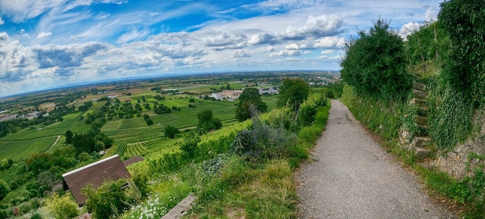 Am Friedhof von Handschuhsheim vorbei verlässt man die Stadtgrenzen und fährt angenehm durch eine Schrebergartensiedlung. Bei Dossenheim kann man den sehenswerte Tagebau Leferenz besuchen. Weiter geht es am Rand von Dossenheim entlag bis unter die Ruine Schauenburg. Ab hier föhrt man auf einem herrlichen Weg weitgehend eben durch Weinberge und Gärten. Der Ausblick auf die Rheinebene ist umfassend. Eine Stelle erfordert nochmals einen knackigen, kurzen Anstieg, dann bleibt es weitgehend eben in den Weinbergen bis zur Strahlenburg zurück
