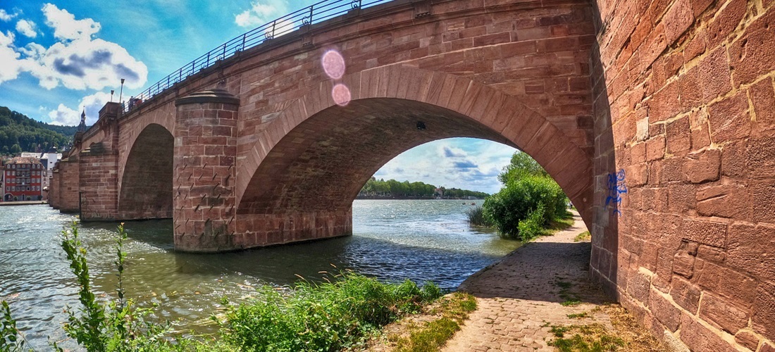 Zwar ist der Weg unterhalb der Uferstrasse an sonnigen Tagen sehr belebt, dennoch lohnt es sich, dort unten entlang zu fahren. Vorbei an der Schleuse Heidelberg erkennt man gegenüber das prächtige Schloss von Heidelberg. Unter der Alten Brücke entlang geht es dann an den Ortsrand von Neuenheim. Auf einer Seitenstrasse umgeht man die vielbefahrene Brückenstrasse.