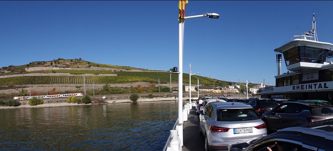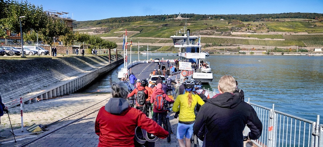 Die Fähre Bingen – Rüdesheim bringt einen an das andere Ufer. Von dort geht es Richtung Assmannshausen. Der Radweg ist zwar unmittelbar neben der Strasse, jedoch massiv davon getrennt. So fährt man sicher und entspannt Richtung Norden unter der Ruine Ehrenfels entlang.