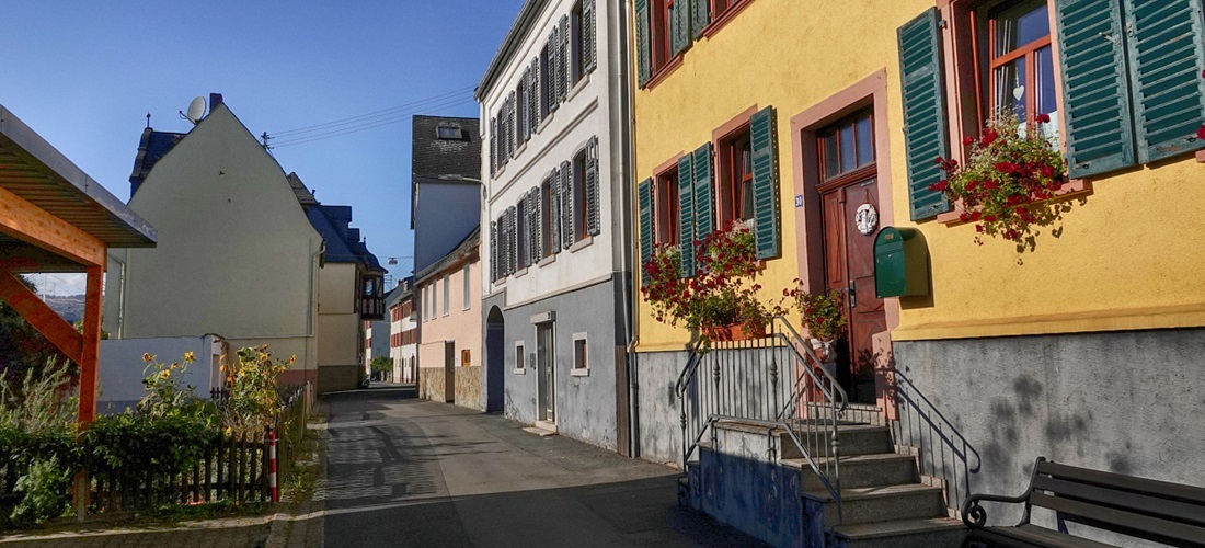 Etwas oberhalb leitet die Strasse nach Lorchhhausen. Gegenüber liegt Niederheimbach mit der mächtigen Burg Hohneck.