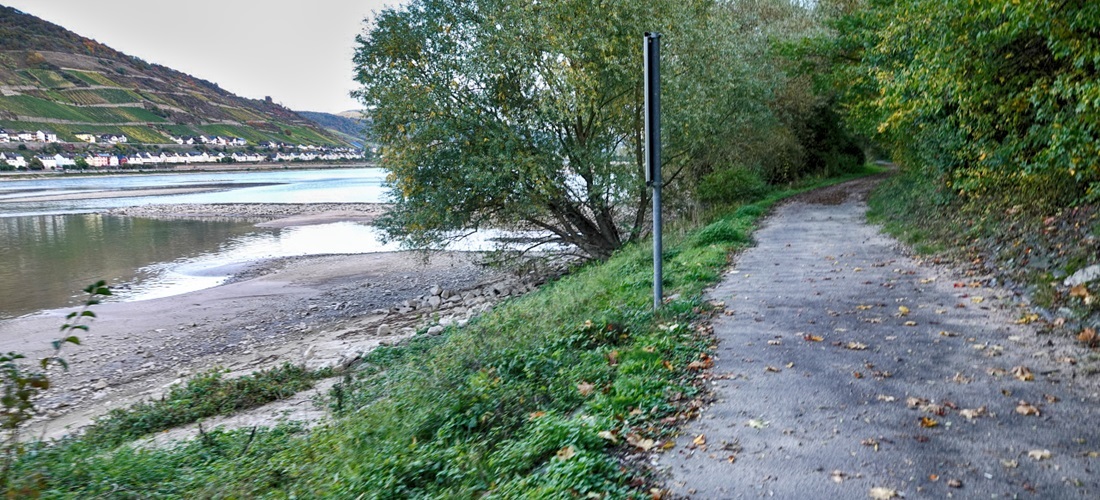 Im Herbst 2021 ist die Durchfahrt von Assmannshausen nach Lorch wegen einer Baustelle an der B42 vollständig gesperrt. Wer also hier weiterfahren will, muß – siehe GPS-Track – über die Weinberge steil nach oben fahren. Sechs Spitzkehren später ist man weit über dem Rhein und genießt aus einem Aussichtspavillion einen herrlichen Blick. Noch etwas weiter geht es bergauf und schon hier sollte man besser mit einem Trekking- oder Mountainbike unterwegs sein.