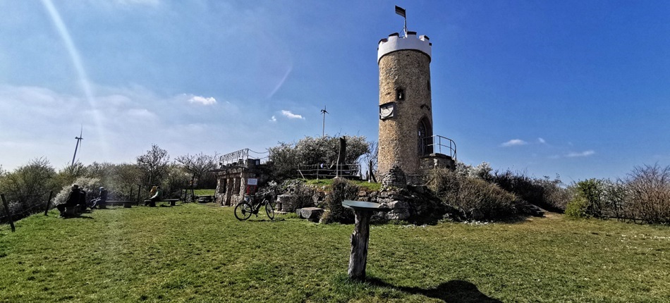 Kurz geht es recht steil bergauf. Nun erfreut man sich wieder an der Schubkraft des Elektromotors, denn so gelangt man ohne allzu große Mühen hinauf zum Warteturm. Herrlich auf einem sanften Hügelkamm gelegen, gewährt der (nicht zugängliche) Turm mit seiner schönen Rastanlage einen umfassende Aussicht. Hier sollte man einen längeren Stopp einlegen und die Landschaft genießen.